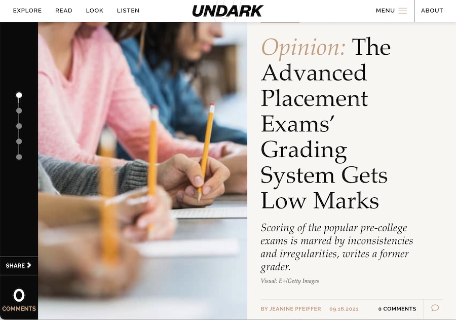 Today, Undark, the prestigious online magazine housed at MIT, published my whistle-blowing Op-Ed, “The Advanced Placement Exams’ Grading System Gets Low Marks.”
