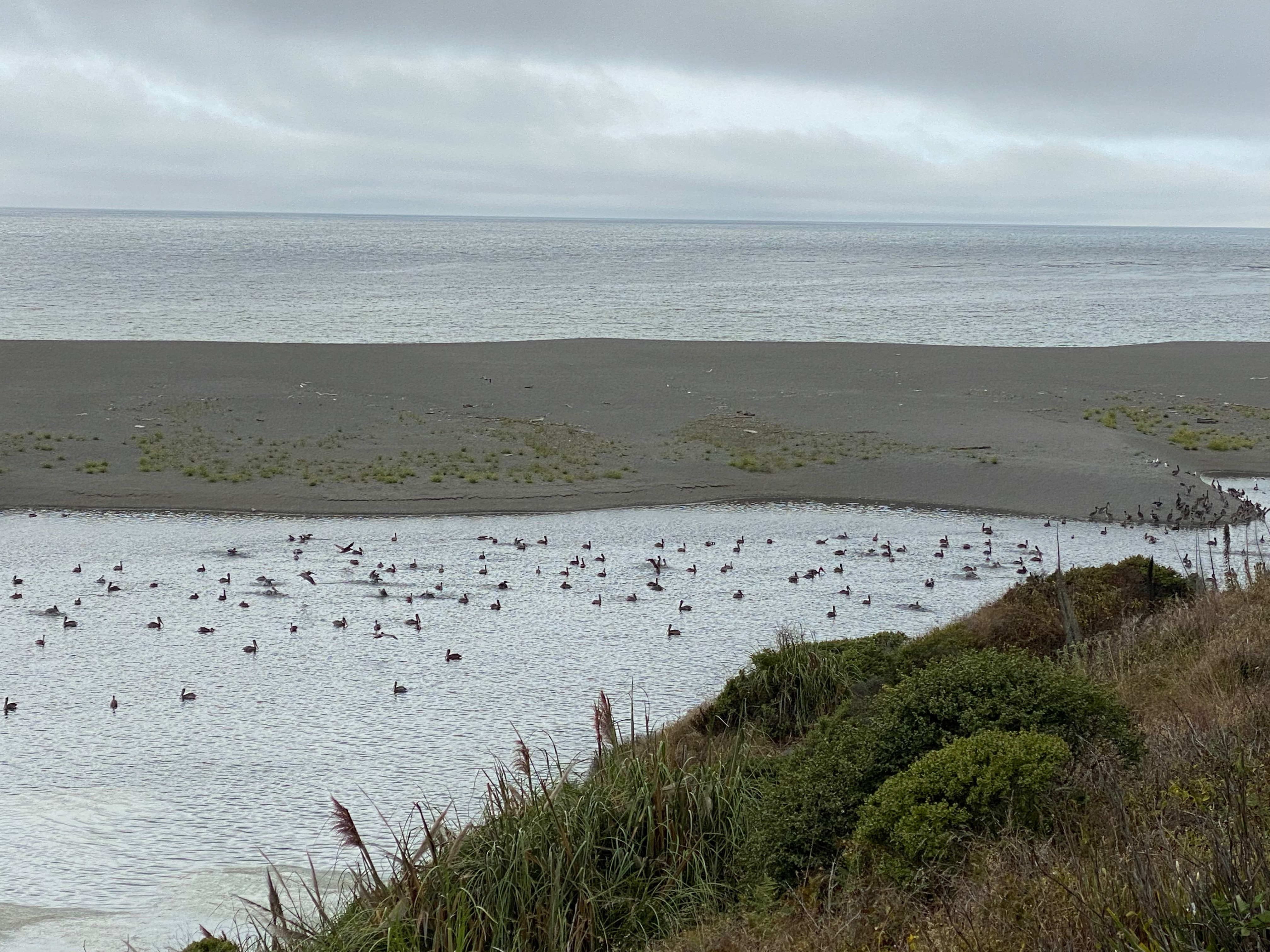 Just on the other side of the beach – where the Gualala River meets the ocean – more pelicans were gathered in a lagoon, beating their wings against the surface of the water: a new sound to me, that was beyond thrilling. As an ecologist, this signaled to me that life was returning to our coastline: and most especially, the re-emergence of bull kelp, the foundation species and “rainforest of the ocean” that had largely disappeared for the past few years.
