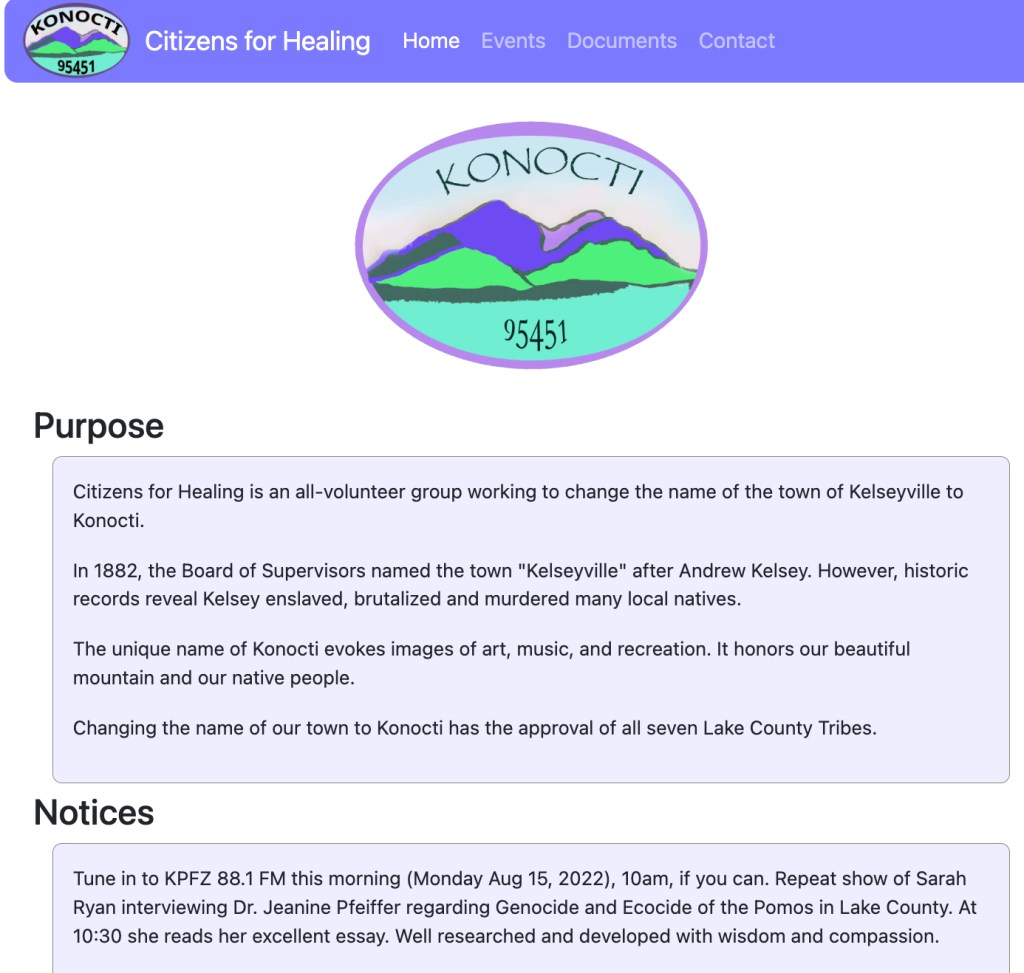 Attempts to rename Kelseyville as “Konocti,” a name honoring the sacred mountain, Mt. Konocti, overlooking Clear Lake, are gaining traction, as part of any effort led by a local group, Citizens for Healing. In association with a series of monthly meetings held around Clear Lake, on Sunday, August 14th, a panel discussion headed by Big Valley Band of Pomo Indians elder and THPO Director Ron Montez, Sr. provided hours of testimony by Natives of the pervasive, multigenerational trauma elicited by the town’s name.
